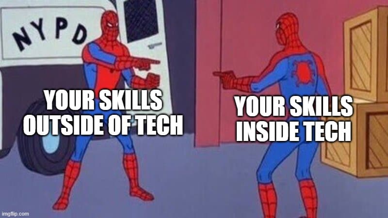 Now that you have chosen an industry let's talk about skills. The easiest way to break into tech is to utilize the skills that you already have. Think about both the soft and hard skills that you already have. If you have skills in marketing, look to take those same skills with you into the tech industry.